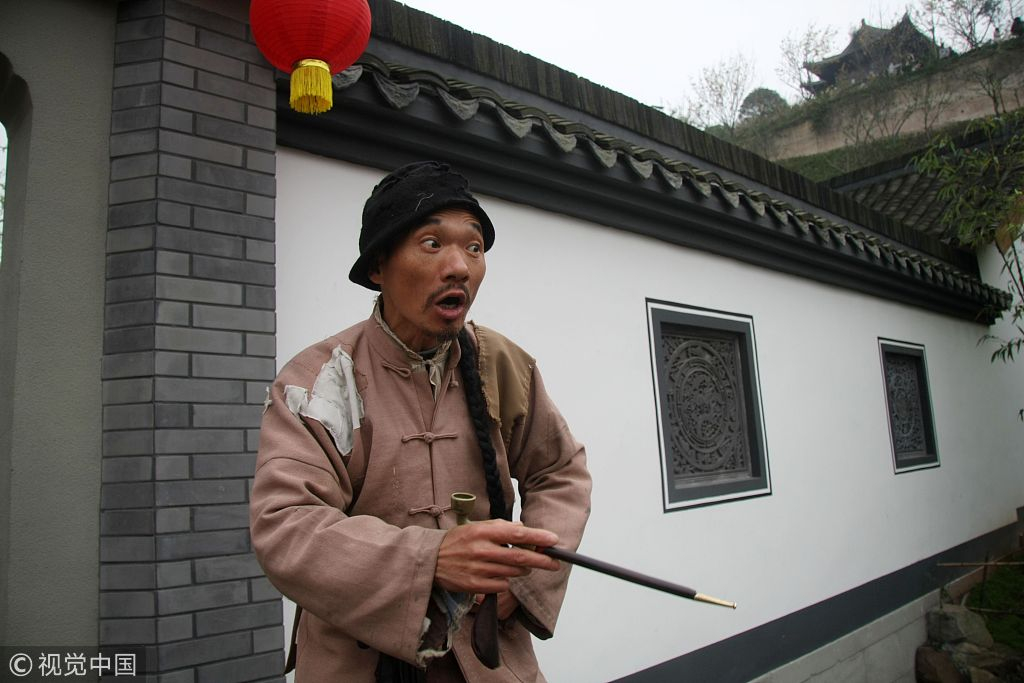 An actor in costume plays Ah Q, a character in a novella by Lu Xun, in an exhibition in Chongqing, December 2011. /VCG Photo