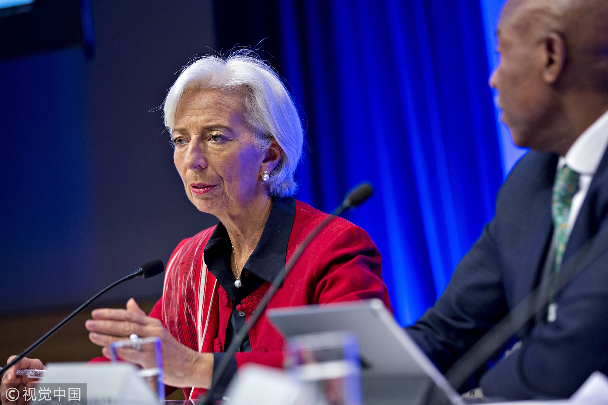 Christine Lagarde, managing director of the International Monetary Fund (IMF), speaks as Lesetja Kganyago, governor of the South African Reserve Bank, right, listens during an International Monetary Fund Committee (IMFC) news conference, Washington, DC, US, April 21, 2018. /VCG Photo