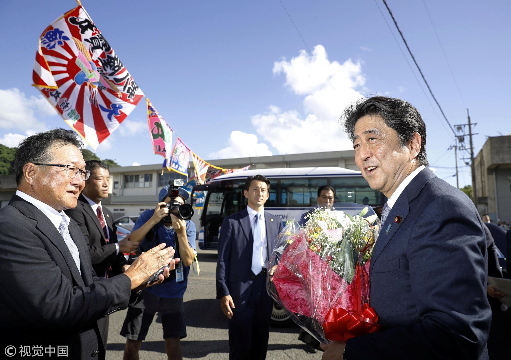 Japanese Prime Minister Shinzo Abe smiles as he receives a bouquet after announcing his candidacy for the ruling Liberal Democratic Party (LDP) leadership election in Tarumizu, Kagoshima Prefecture, Japan in this photo taken by Kyodo on August 26, 2018. /VCG Photo