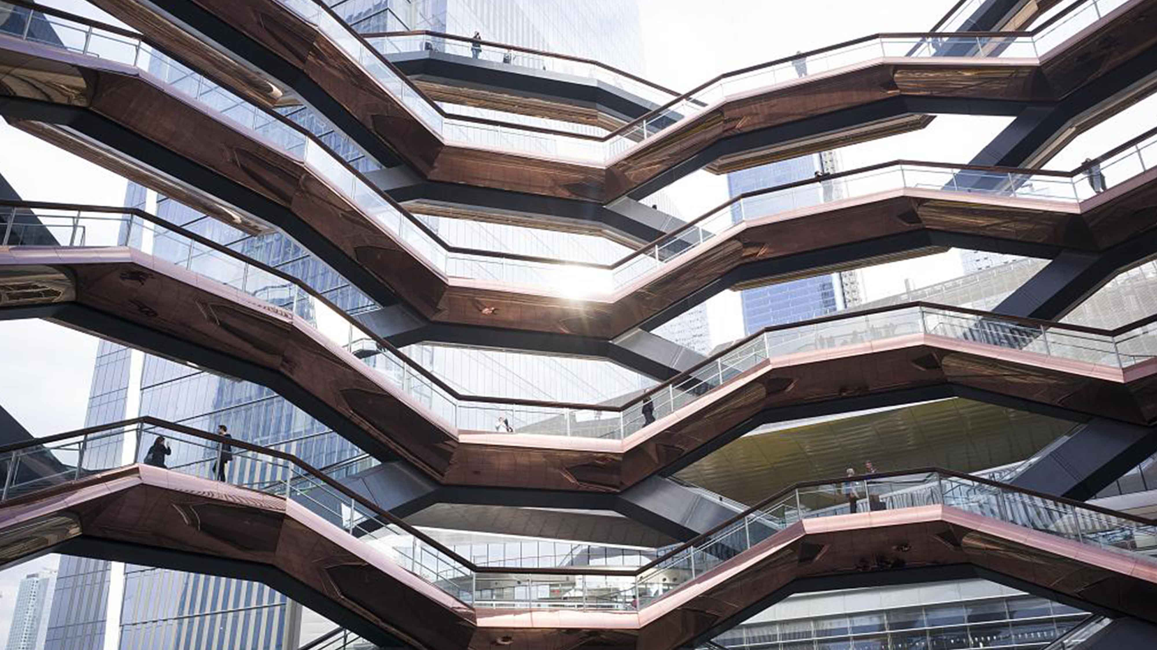 A unique new landmark in New York, "The Vessel," was opened earlier this year and featured a strange honeycomb stairway design, as seen in the incredible video filmed on April 29. Visitors walk up and down the numerous inter-connected stairways.