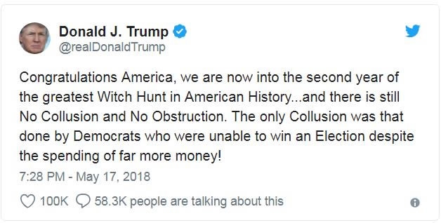 “Congratulations America, we are now into the second year of the greatest Witch Hunt in American History,” US President Trump tweeted.