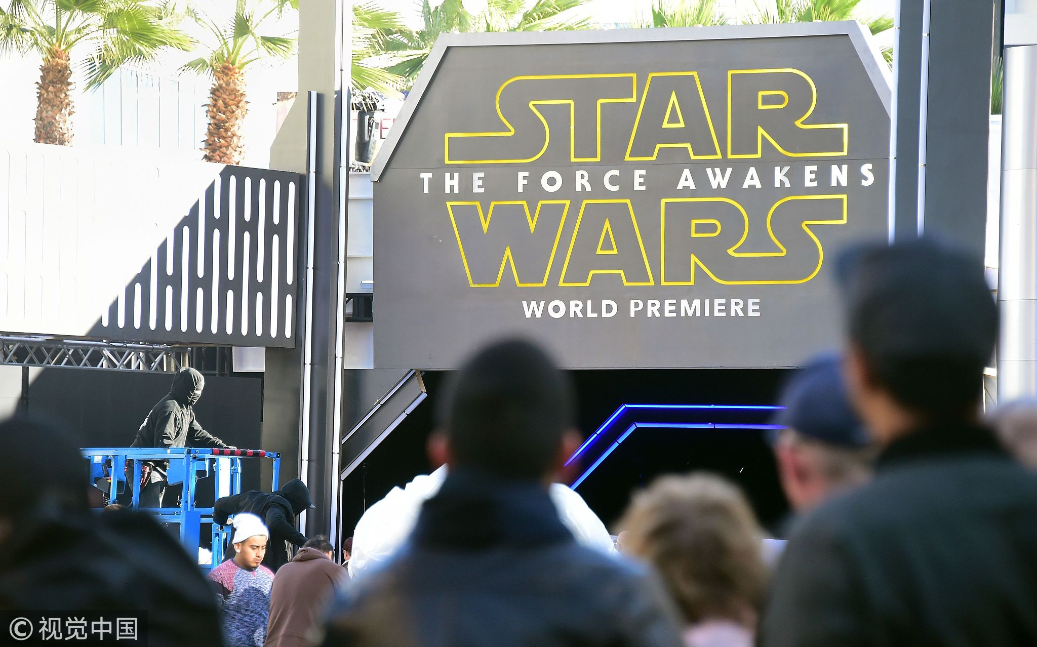 People watch from behind police barricades and closure of streets in Hollywood, California as preparations take place for the premiere of the latest Star Wars film, "The Force Awakens", Dec. 14, 2015. /VCG Photo