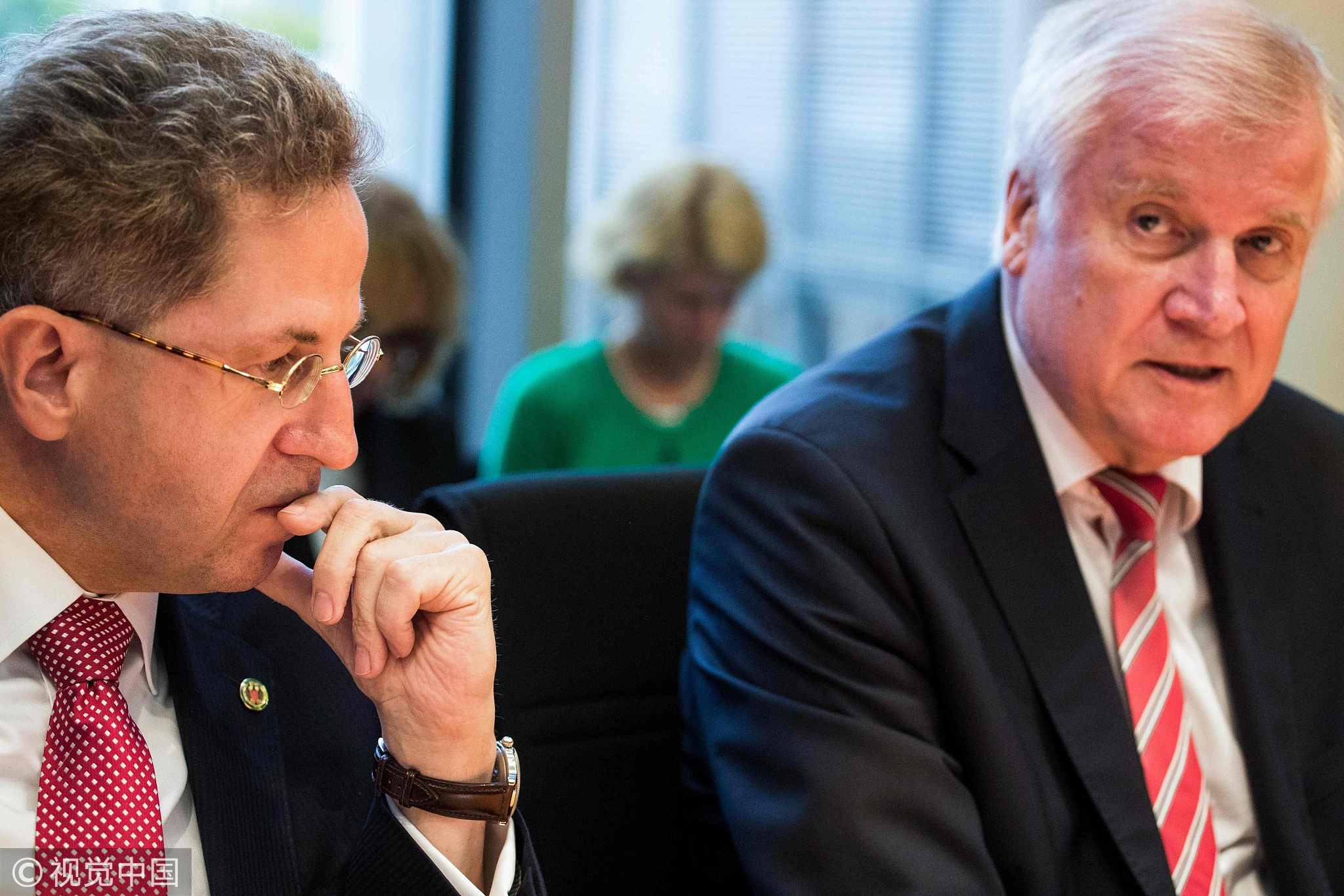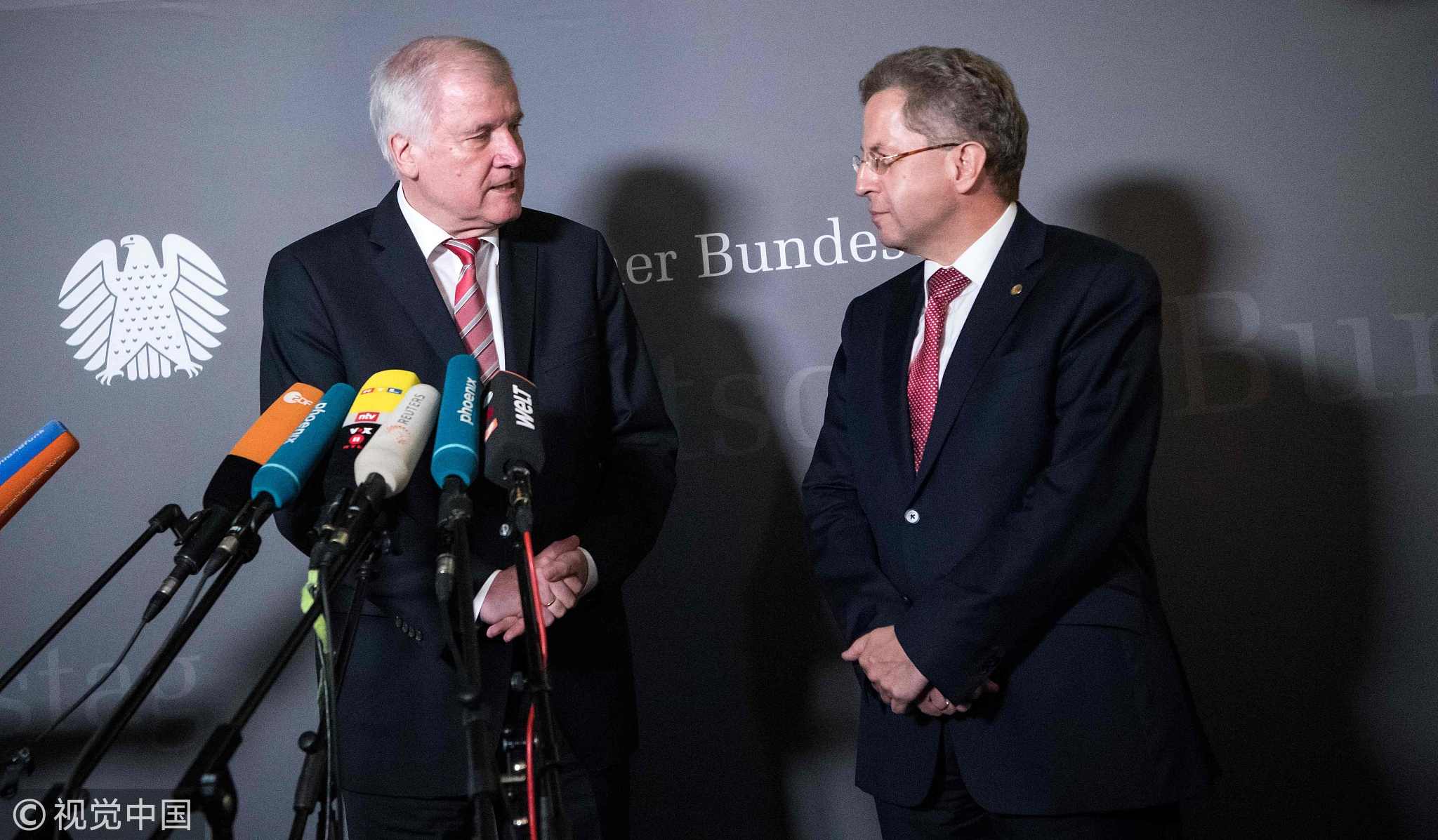 German Interior Minister Horst Seehofer (L) makes a statement next to Hans-Georg Maassen, President of the domestic intelligence service of the Federal Republic of Germany after they faced a parliamentary committee of domestic and security affairs after recent far-right demonstrations in the eastern town of Chemnitz, September 12, 2018. /VCG Photo