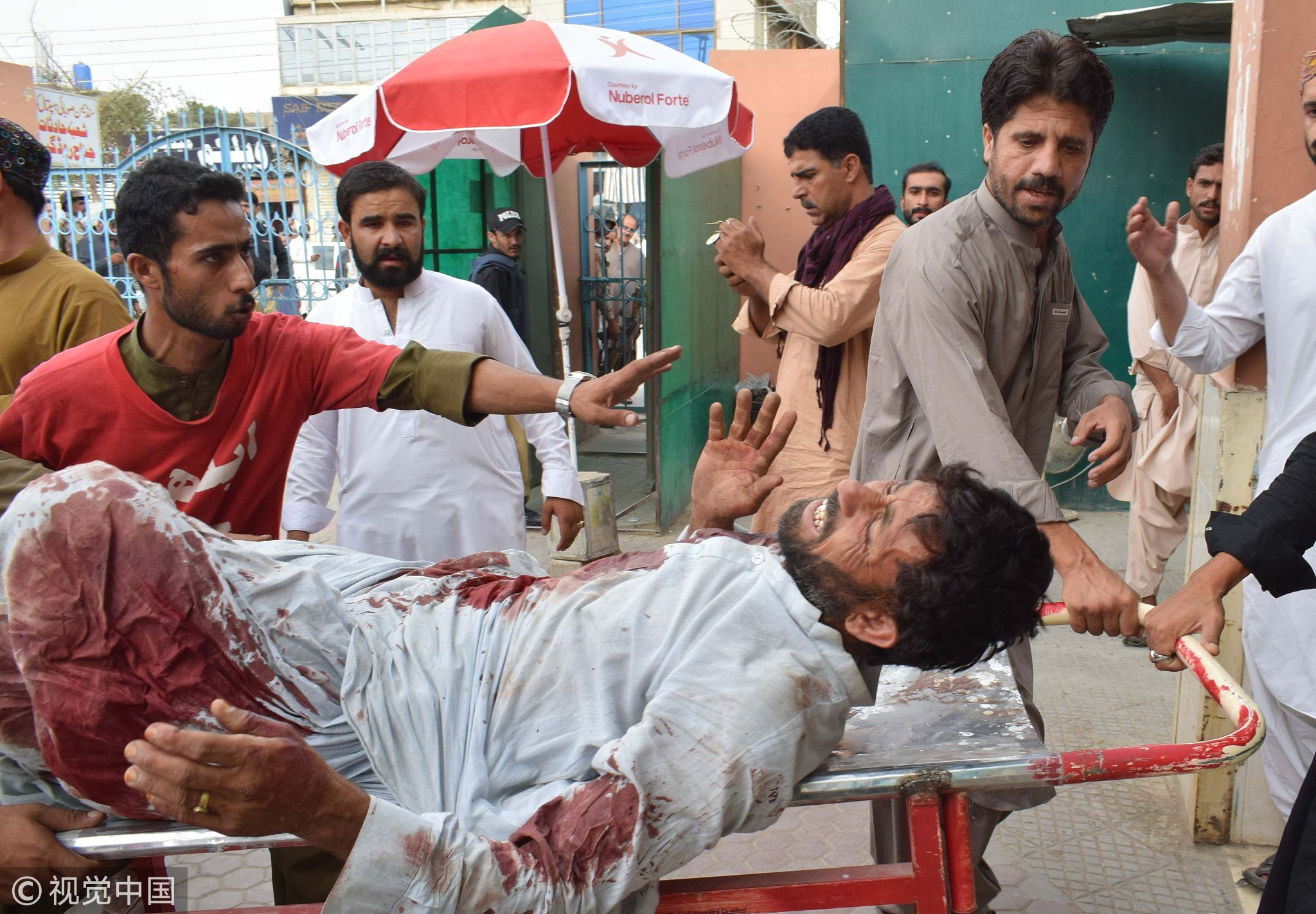 An injured Pakistani man is brought to a hospital in Quetta following the blast on July 13, 2018. /VCG Photo