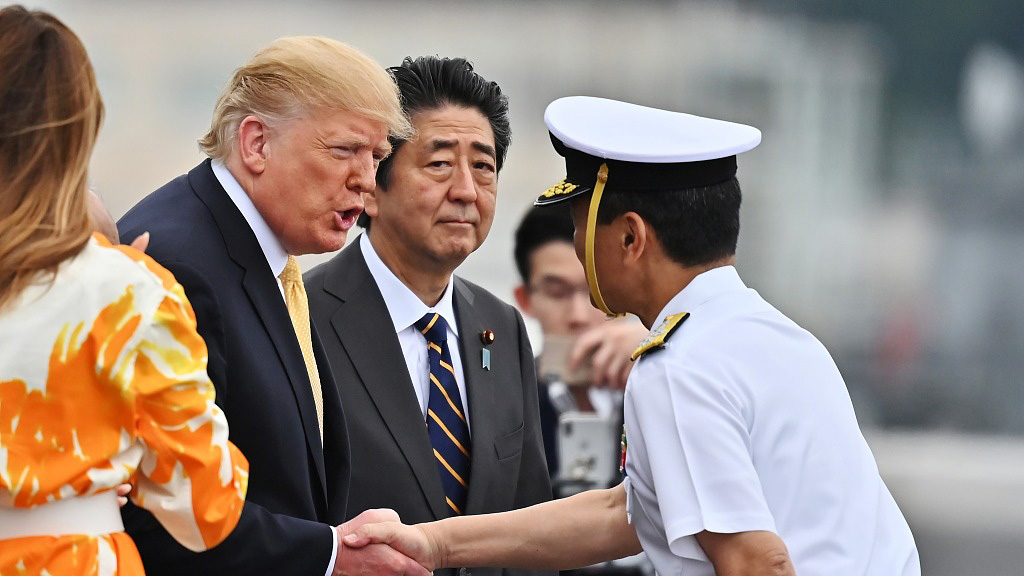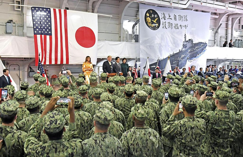 U.S. President Donald Trump, standing next to Japanese Prime Minister Shinzo Abe, addresses American and Japanese troops on the Japanese Maritime Self-Defense Force's helicopter-carrying destroyer Kaga, docked at the MSDF base in Yokosuka, south of Tokyo, May 28, 2019. /VCG Photo