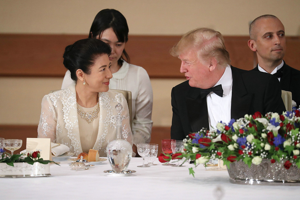 Japanese Empress Owada Masako (L) chats with U.S. President Donald Trump during a banquet at the Imperial Palace in Tokyo, Japan, Monday, May 27, 2019. /VCG Photo