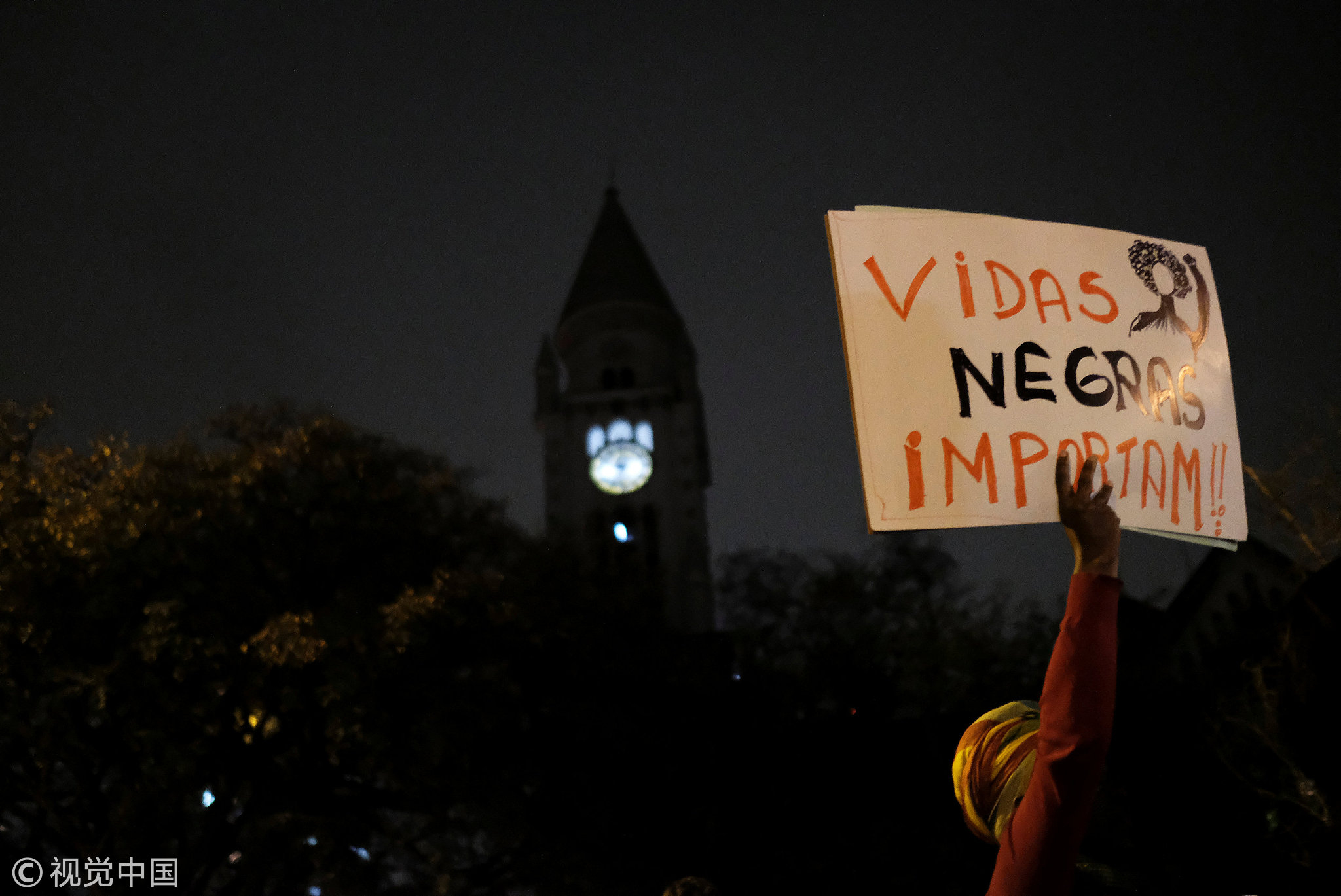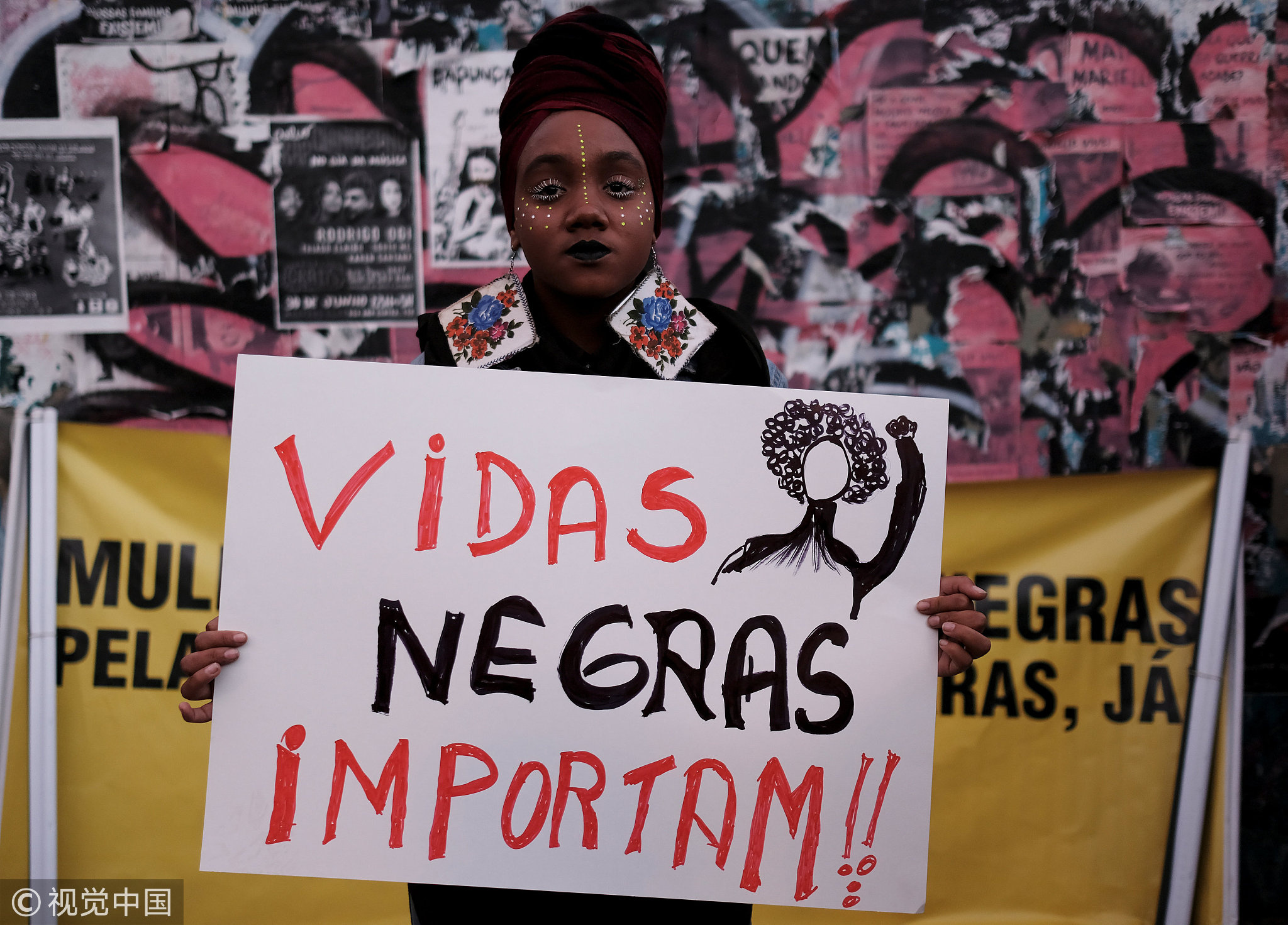 A demonstrator holds a sign reading "Black Lives Matter" while taking part in a protest by black women against racism and machismo in Sao Paulo, Brazil, July 25, 2018./ VCG Photo