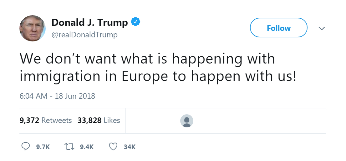 "We don't want what is happening with immigration in Europe to happen with us!" he said in a pair of tweets.