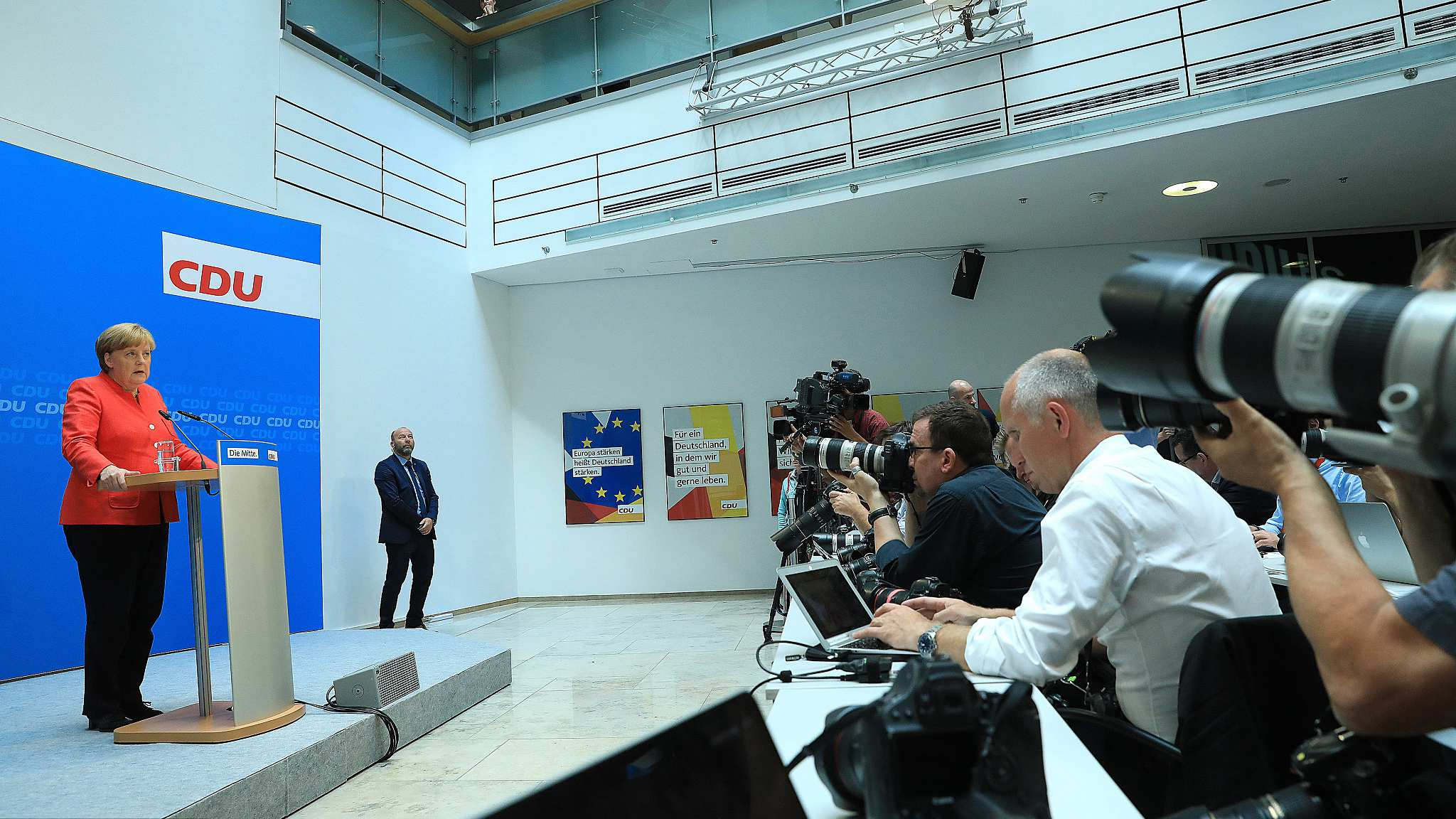Angela Merkel, Germany's chancellor and leader of the Christian Democratic Union (CDU) party, speaks during a news conference at the CDU headquarters in Berlin, June 18, 2018. /VCG Photo