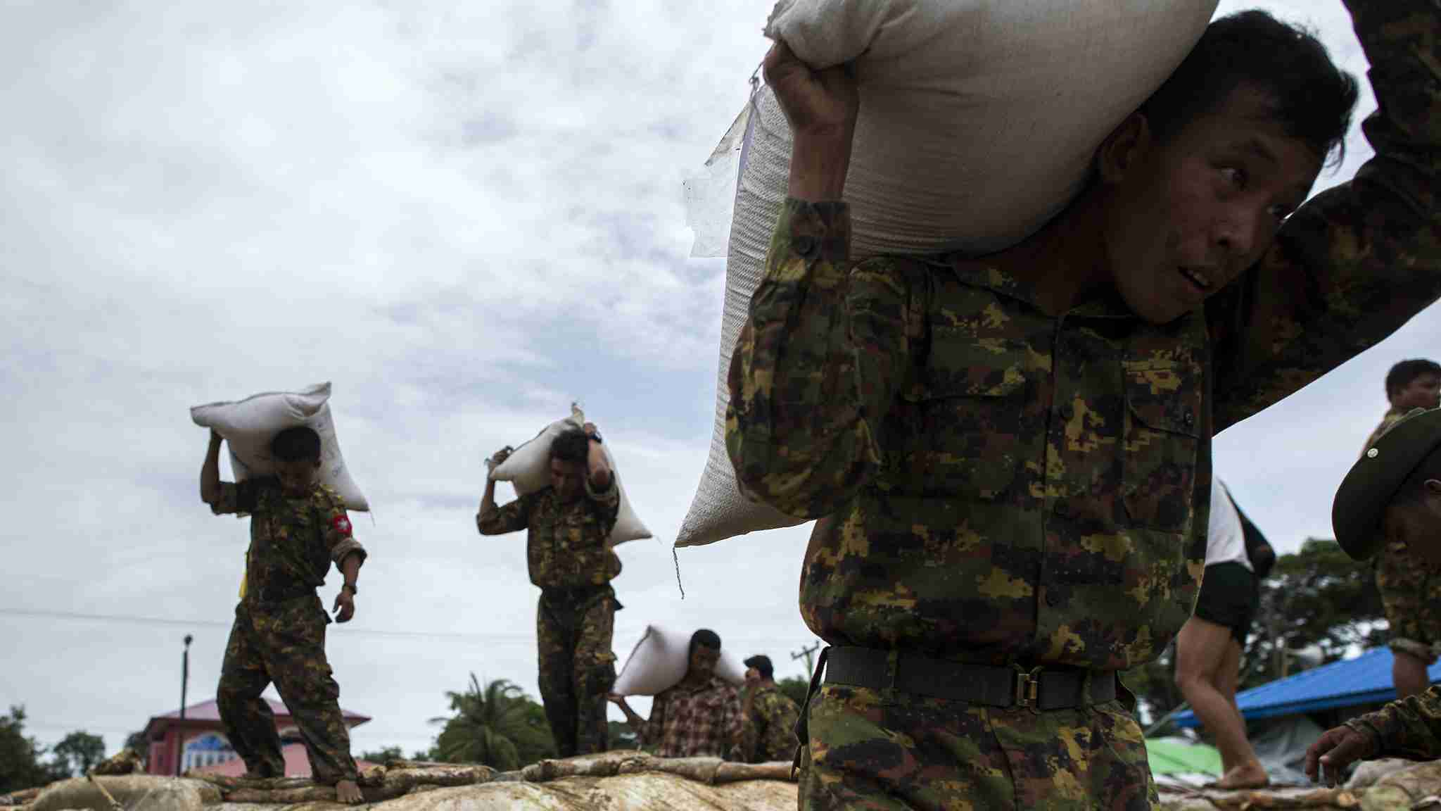 Myanmar soldiers load relief goods on a boat in Shwegyin, Bago region, August 1, 2018. /VCG Photo
