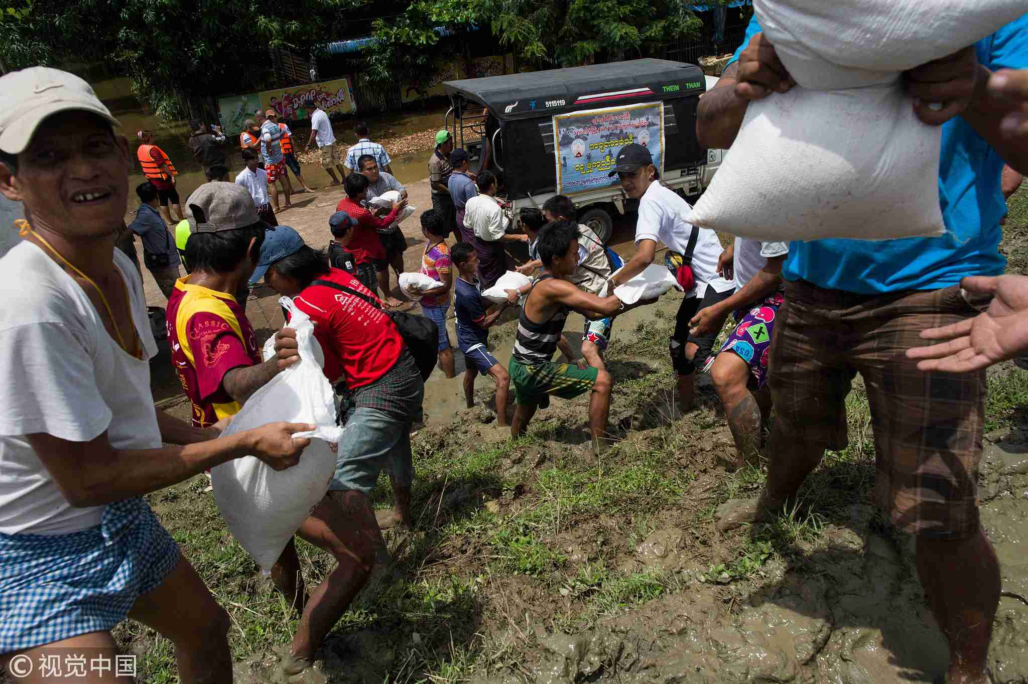Volunteers load relief goods on a boat in Shwegyin, Bago region, August 1, 2018. /VCG Photo