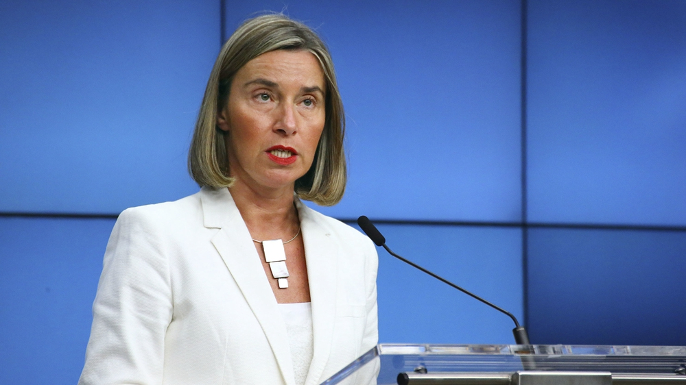 Federica Mogherini, European Union high representative for Foreign Affairs and Security Policy, speaks at a press conference after a meeting with foreign ministers of Iran, Germany, Britain and France in Brussels, Belgium, May 16, 2018. /VCG Photo