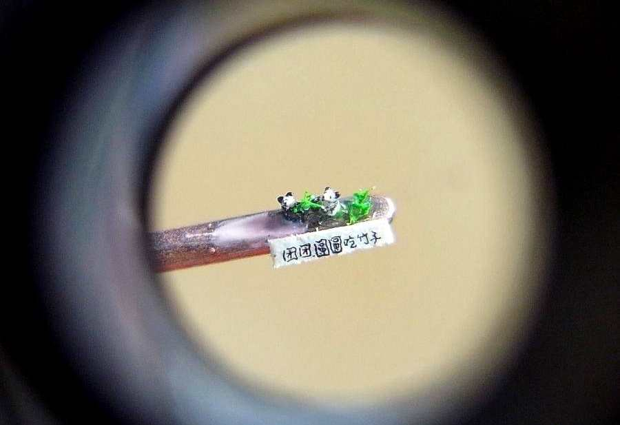The miniatures depict the chubby bears, only 0.7 mm tall each, as they eat bamboo. Later, after Tuantuan and Yuanyuan had a baby called Yuanzai in 2013, Chen added a miniature of Tuanzai to his panda collection.