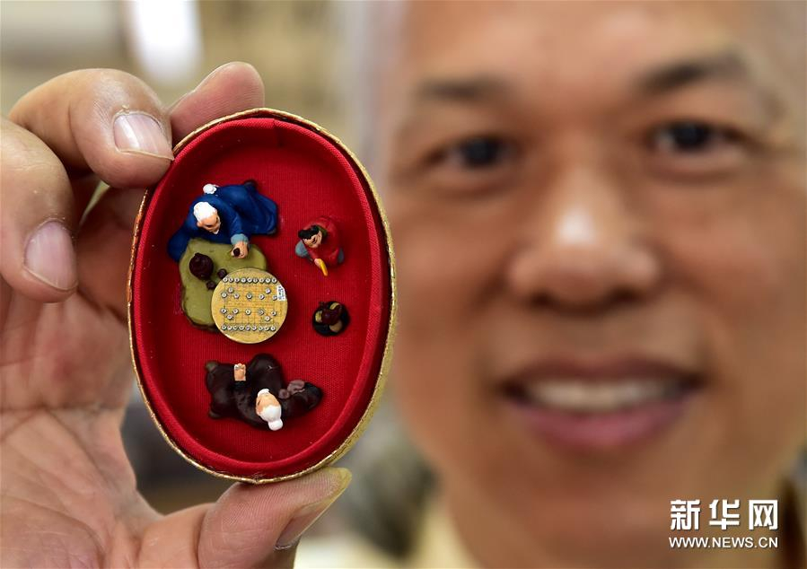 Miniature artist Chen Forng-Shean creates his work with the theme of Chinese Chess on May 3, 2017. /Xinhua