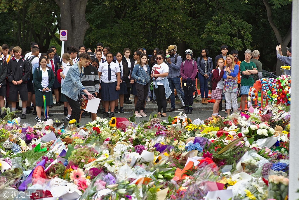 High school students pay tribute to the victims of the mosque terrorist attack at Deans Ave vigil near the Masjid Al Noor Mosque, in Christchurch, New Zealand, March 18, 2019. /VCG Photo