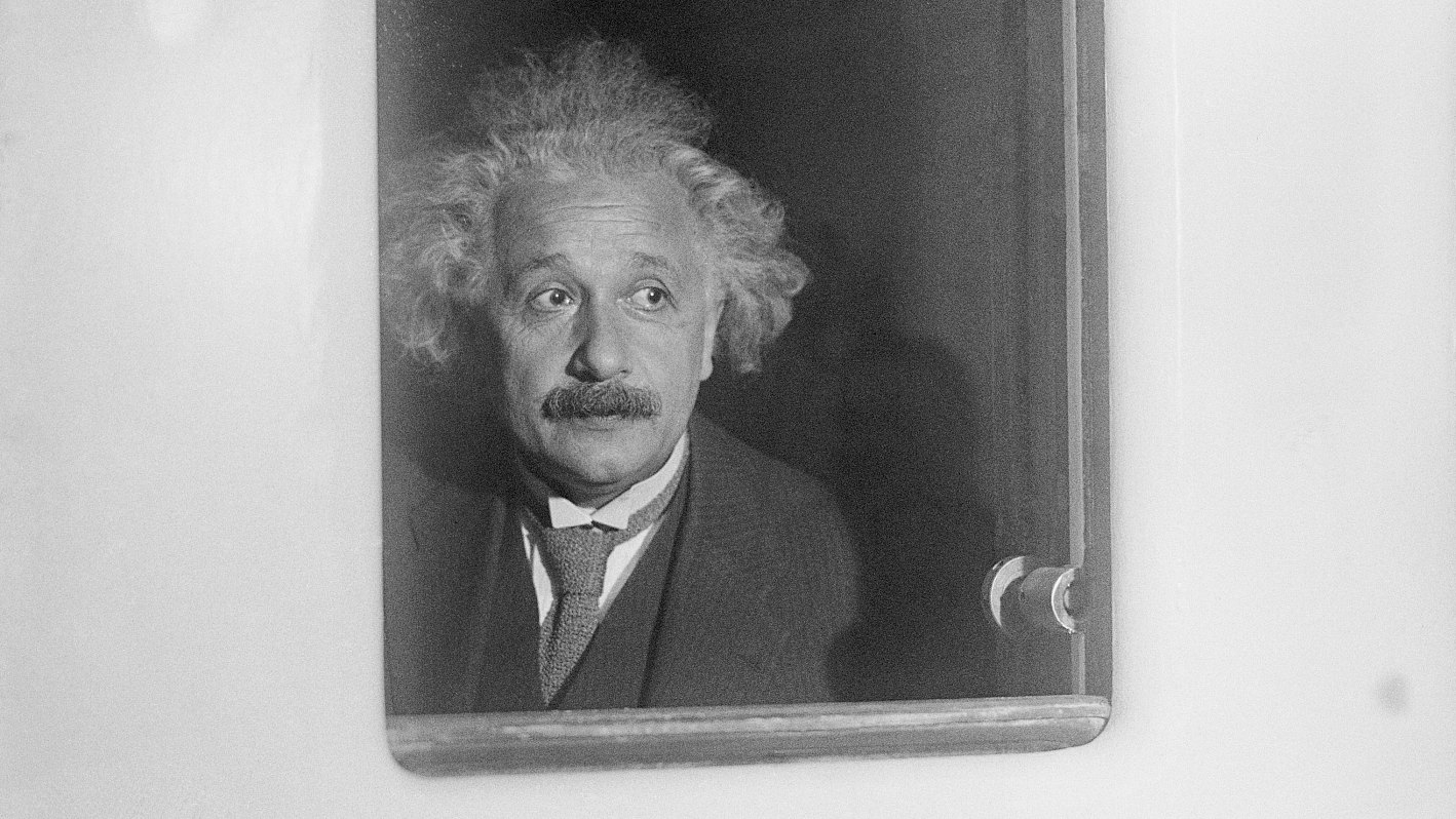 File: Albert Einstein in a window on the S.S. Belgenland upon arrival at Pier 59 in New York City. /VCG Photo