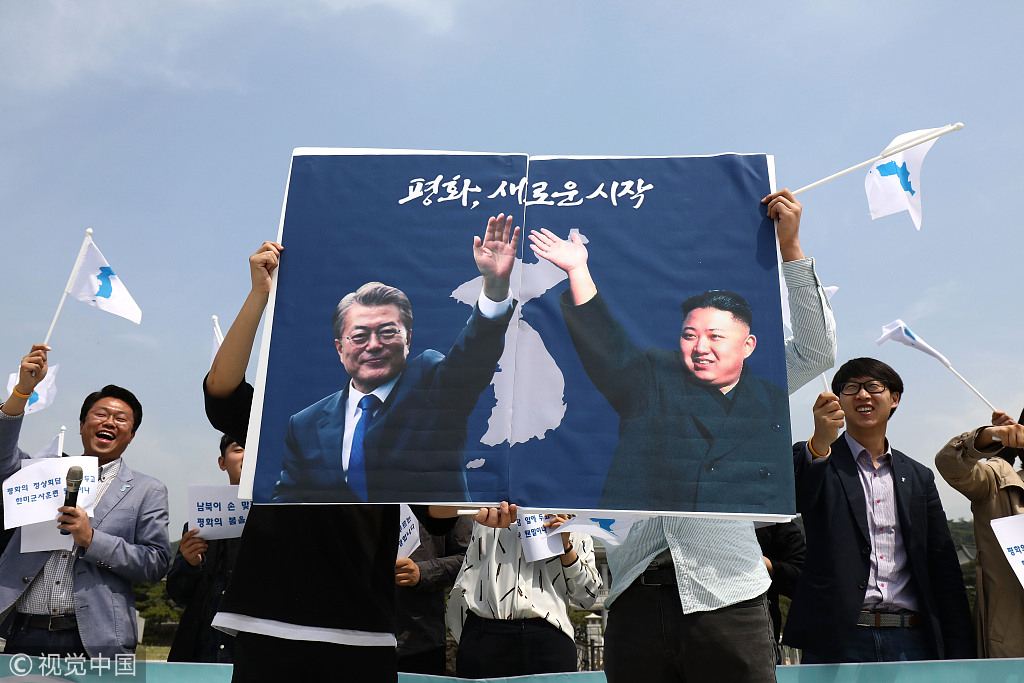 ROK residents flash placards in support of the planned inter-Korean summit outside ROK's Presidential Blue House, Seoul, April 26, 2018. /VCG Photo