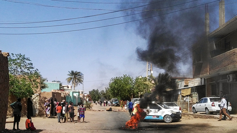 A burning tire blocks the road during a demonstration in Omdurman, March 10, 2019. /VCG Photo
