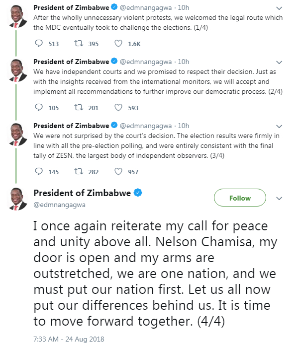 "Nelson Chamisa, my door is open and my arms are outstretched, we are one nation, and we must put our nation first. Let us all now put our differences behind us," he said.