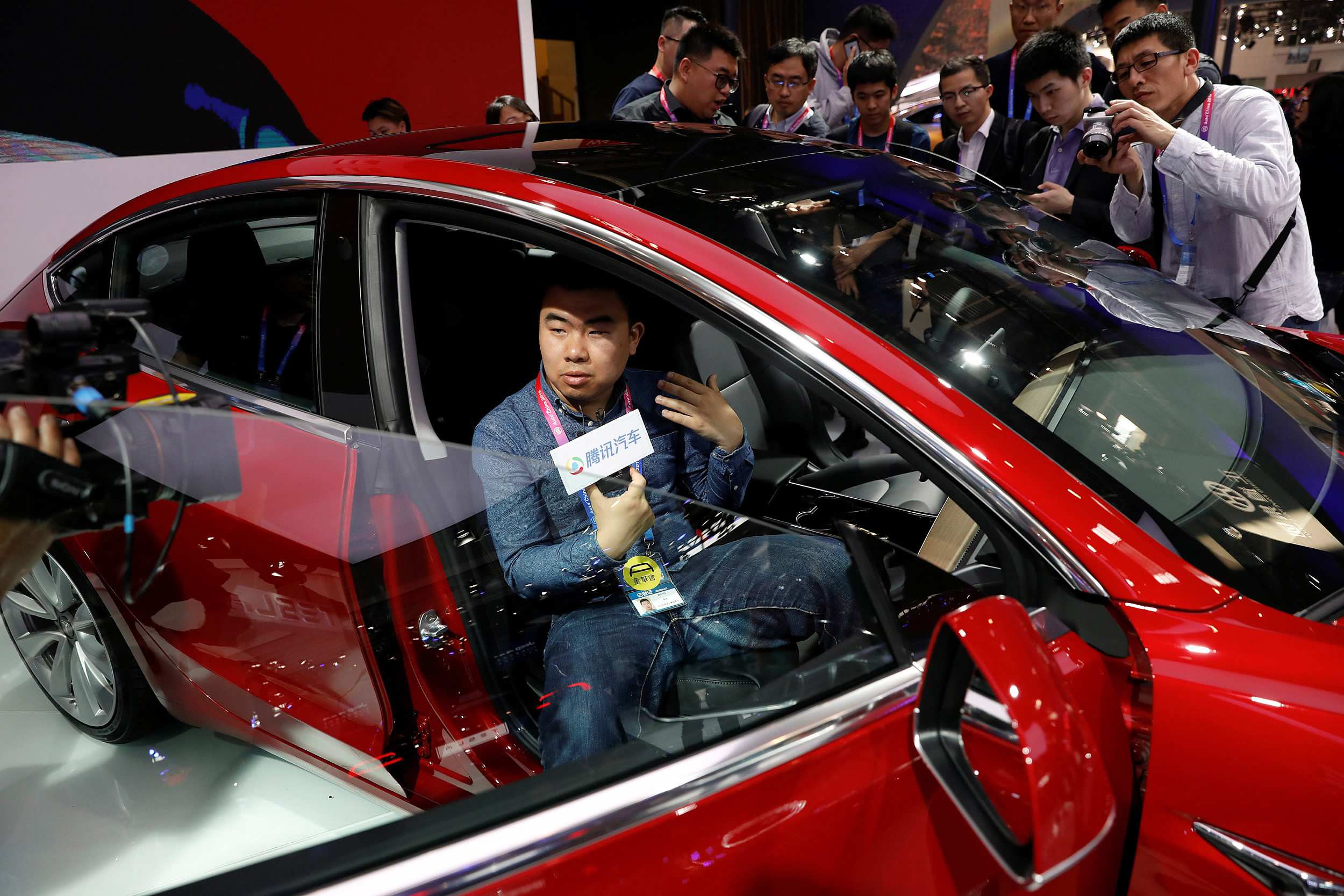 Tesla Model 3 is displayed during a media preview of the Auto China 2018 motor show in Beijing, China, April 25, 2018. /VCG Photo