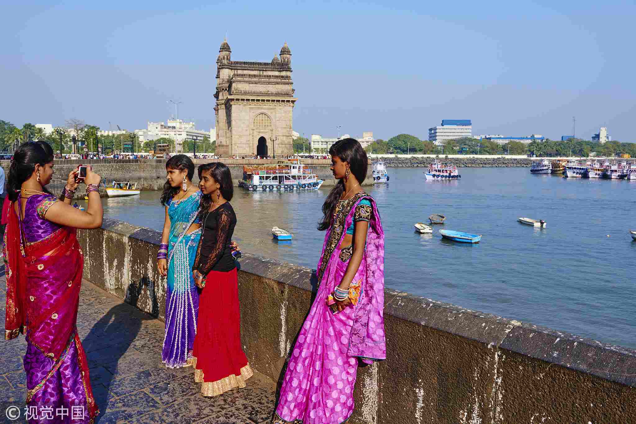 Indian women are taking photos at the Gateway of India, Mumbai, India. /VCG Photo