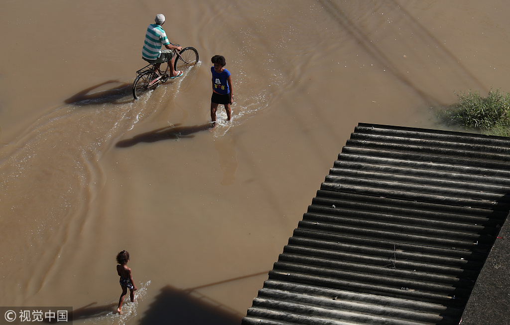 Kids were seen in a flooded street near the Guaratiba neighborhood in Rio de Janeiro, Brazil on Wednesday after heavy rains struck the city on Monday and Tuesday. /VCG Photo
