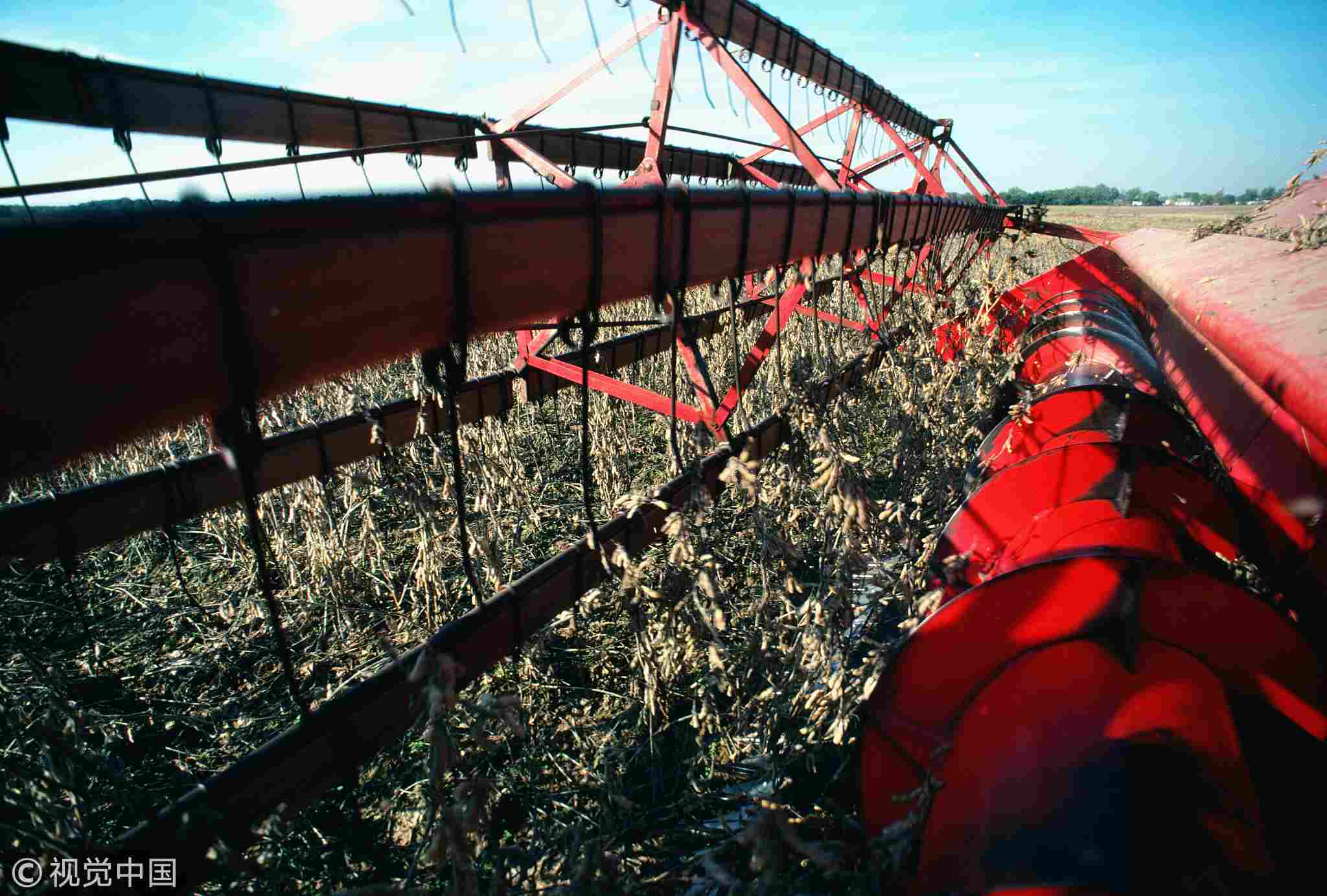 A close-up of combine harvesting soybeans in Maryland. /VCG Photo