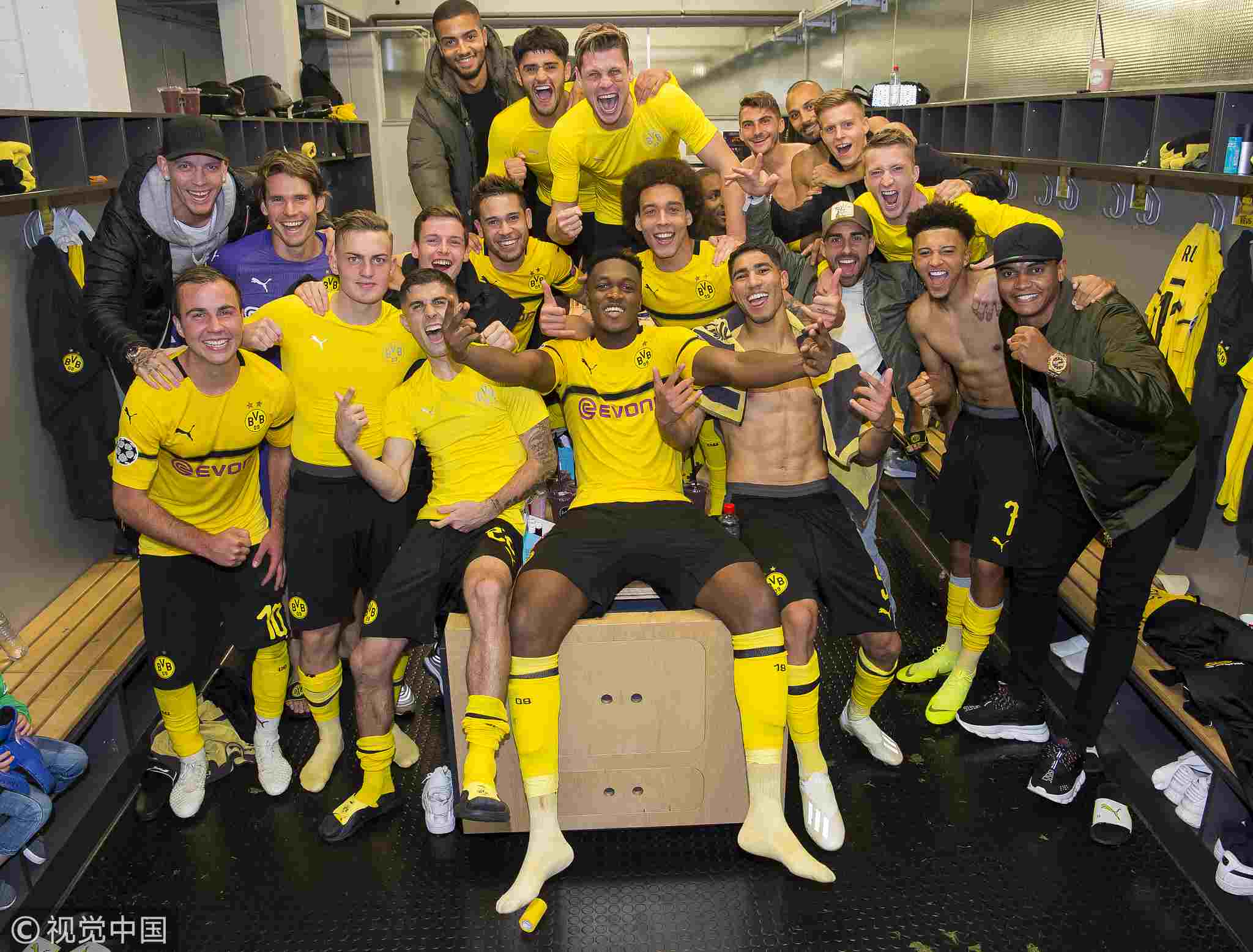 Dortmund players celebrate a 4-0 win over Atletico Madrid at their changing room after the game, October 24, 2018. /VCG Photo