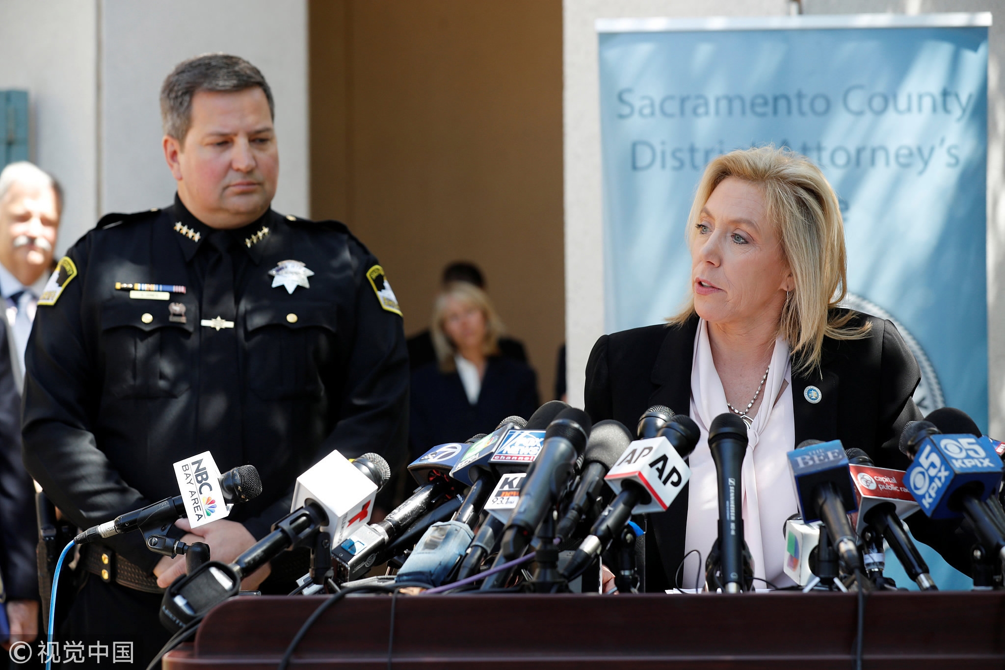 Sacramento District Attorney Anne Marie Schubert (R) and Sheriff Scott Jones (L) announce the arrest of a suspect in the East Area Rapist/Original Night Stalker/Golden State Killer case in Sacramento, California, April 25, 2018. /VCG Photo