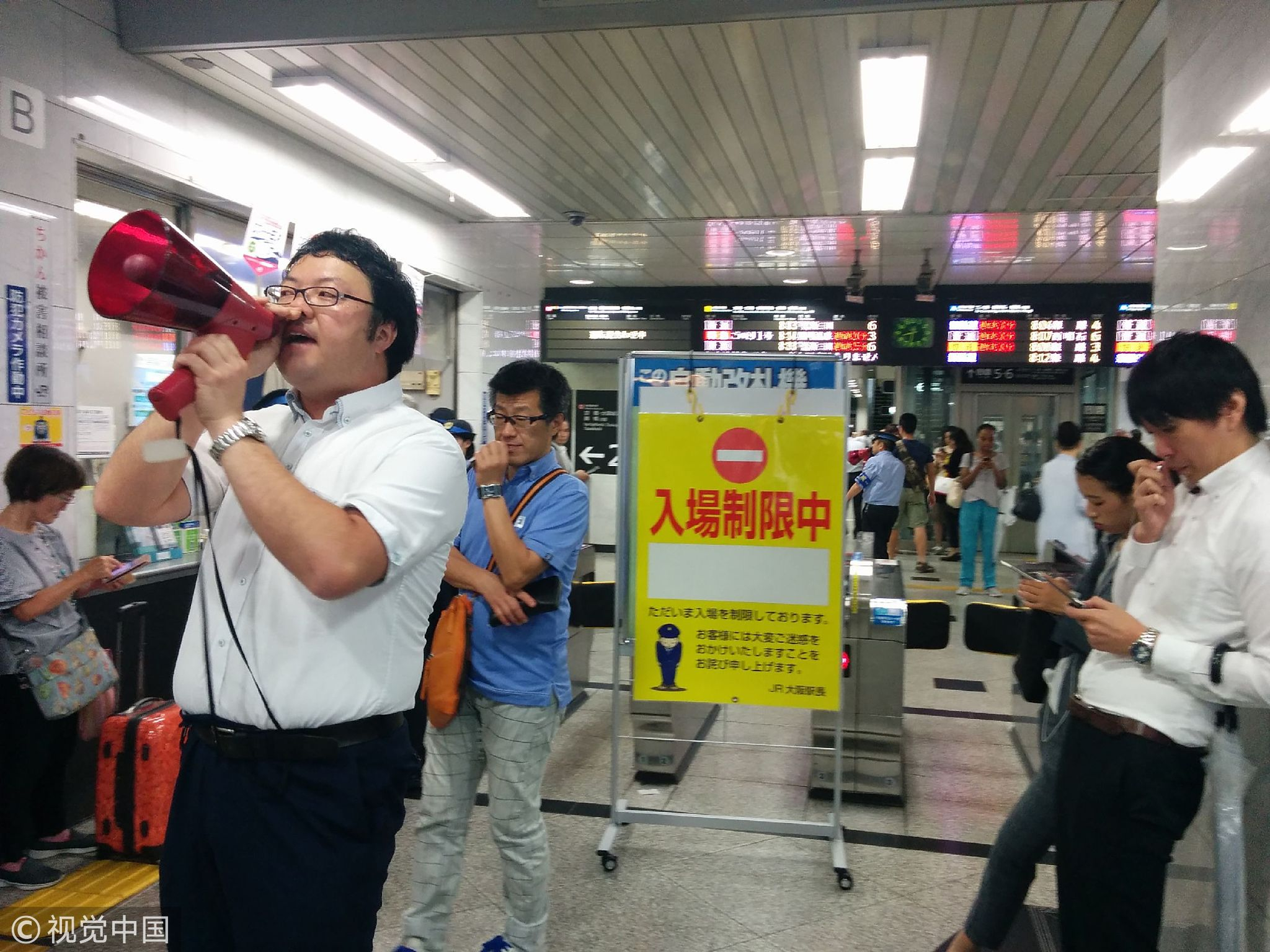 A station employee (L) announces an entry restriction into a railway Station in Osaka, June 18, 2018. /VCG Photo