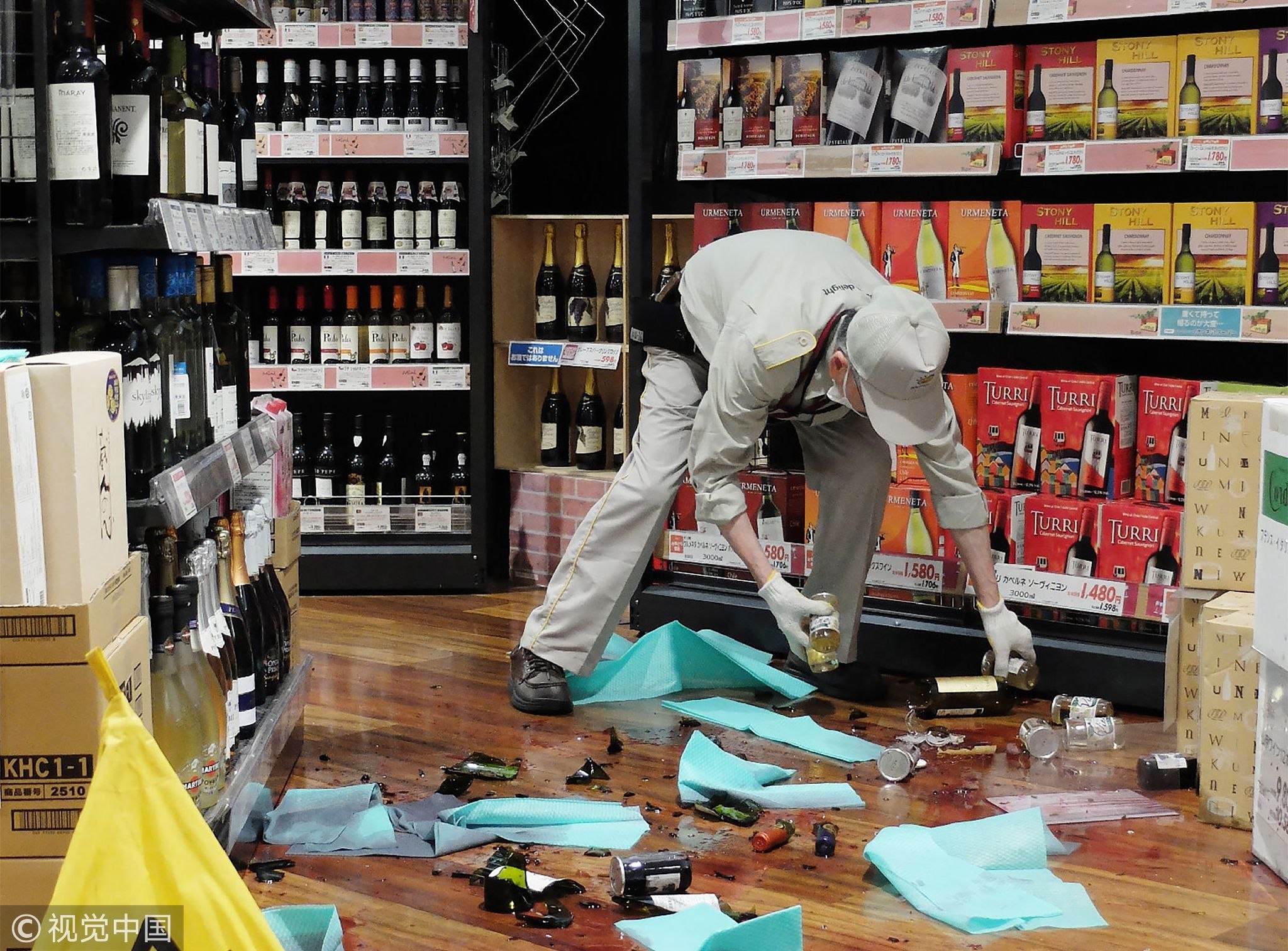 A shop employee clears broken bottles following an earthquake in Osaka, Japan on June 18, 2018. /VCG Photo