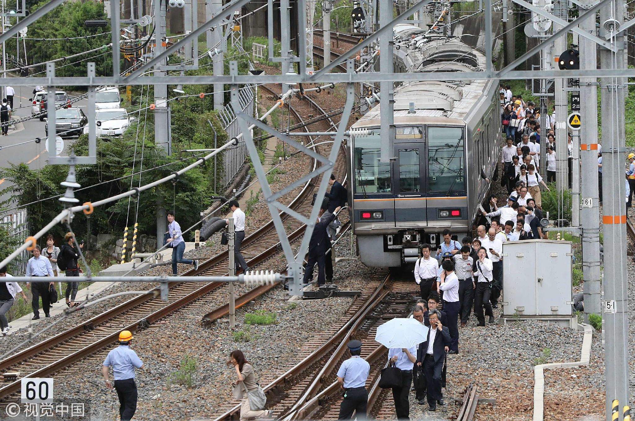 Passengers on a train walk along a railroad track following an earthquake in Osaka, June 18, 2018. /VCG Photo
