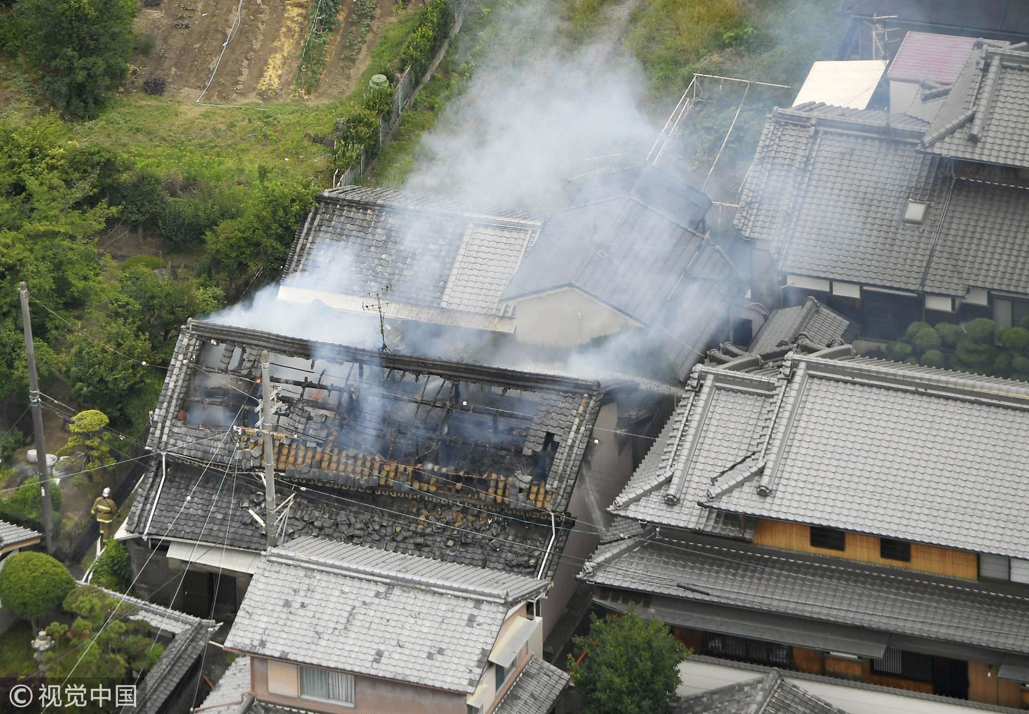 Smoke rises from a house where a fire breaks out, in Takatsuki, Osaka prefecture, western Japan, in this photo taken by Kyodo, June 18, 2018. /VCG Photo
