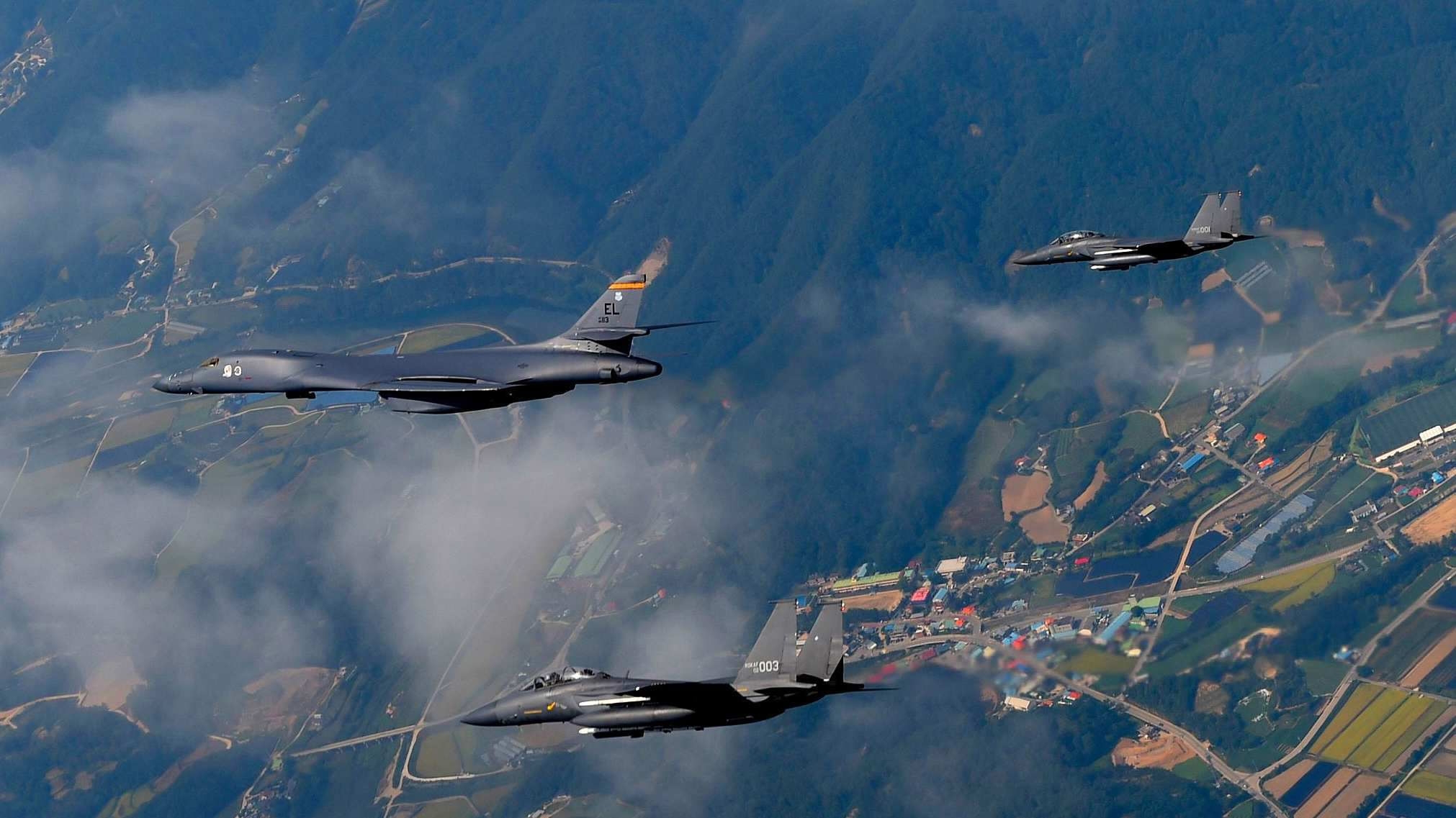 A US Air Force B-1B Lancer(L) deployed to Andersen Air Base, Guam, and two F-15K Slam Eagles assigned to Daegu Air Base, Republic of Korea, flying over ROK skies, September 21, 2016. /VCG Photo
