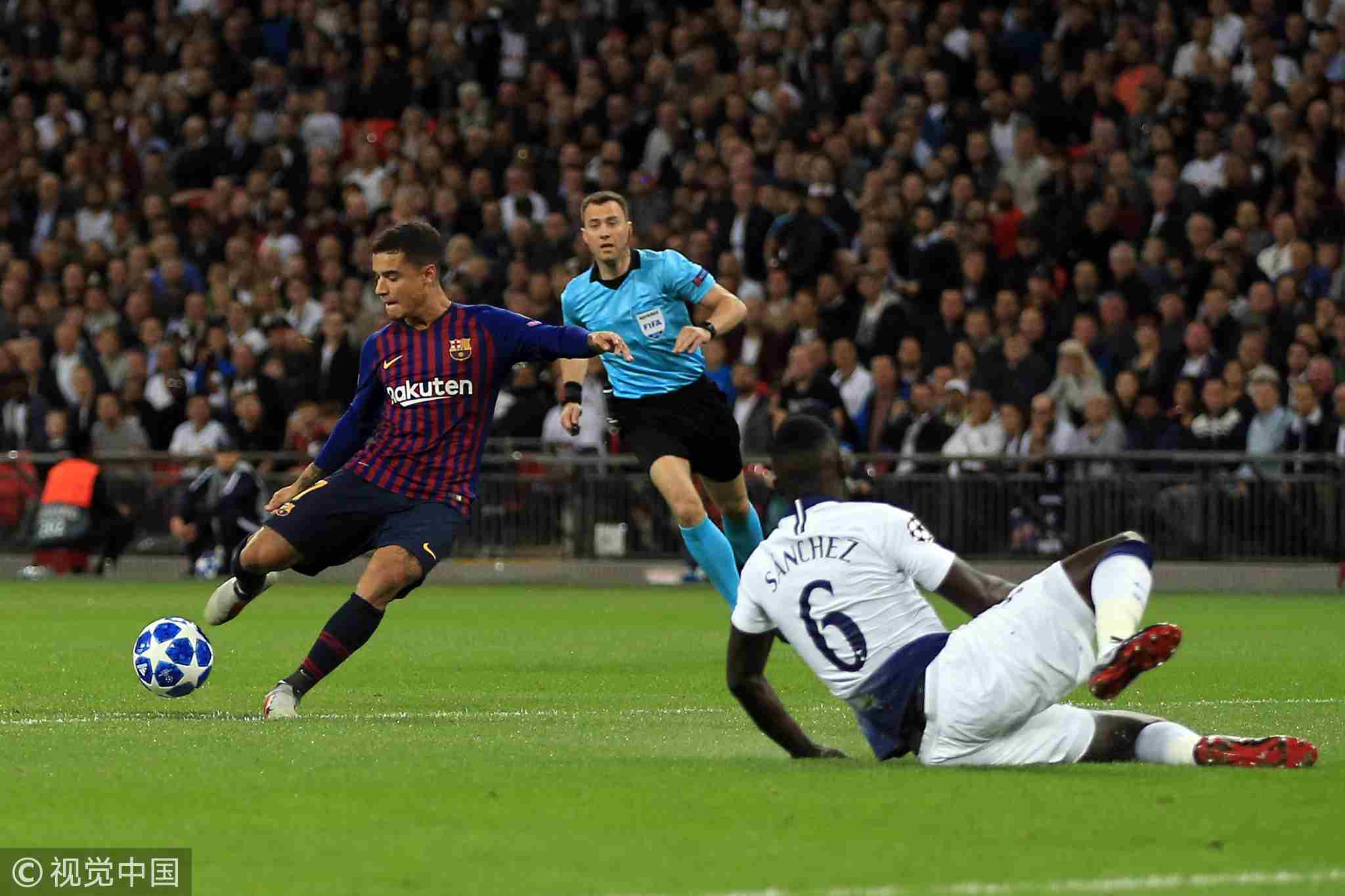 Philippe Coutinho (L) scores the opening goal for Barcelona during the Champions League Group B match at Wembley Stadium on October 3, 2018. /VCG Photo