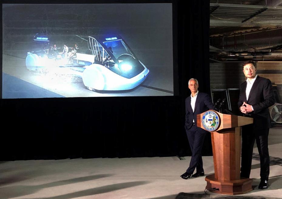 Elon Musk addresses reporters, alongside Chicago Mayor Rahm Emanuel, about his proposal to build a high-speed underground commuter system from Chicago's downtown Loop district to O'Hare International Airport, in Chicago, Illinois, US, June 14, 2018. /Reuters Photo