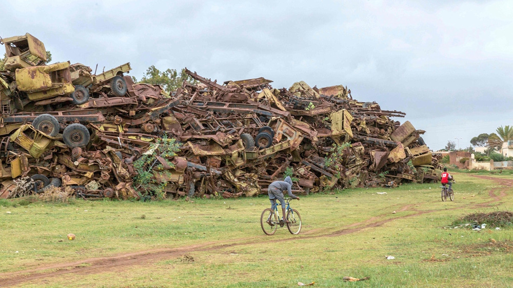 A picture taken on July 20, 2018 shows military tanks and trucks destroyed in the Eritrea-Ethiopia border war, piled as a monument in the Eritrean capital Asmara. /VCG Photo