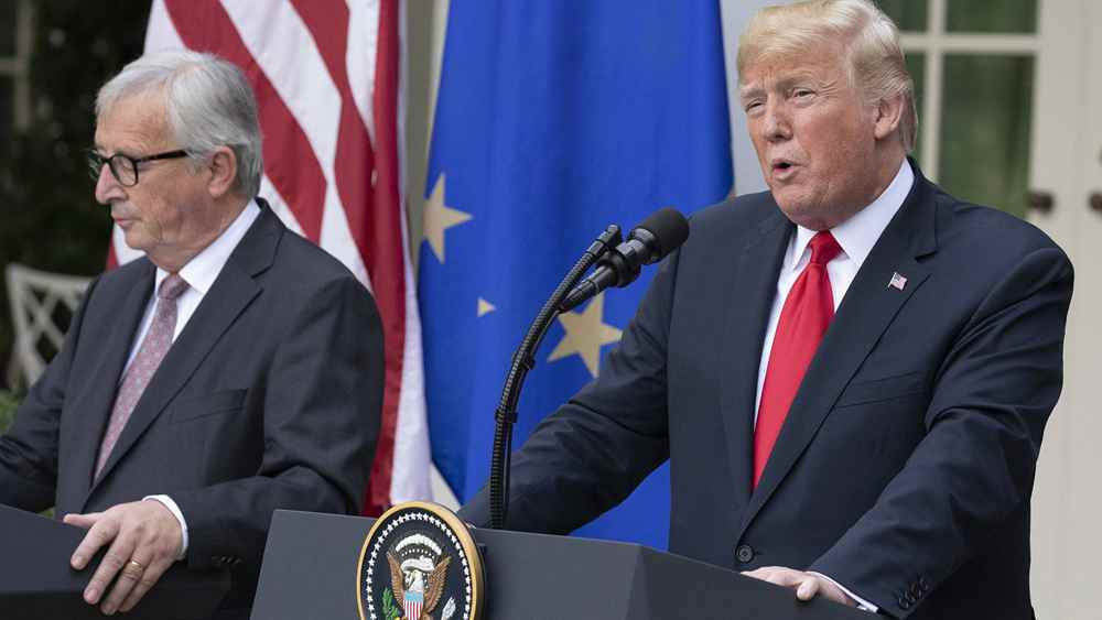 US President Donald Trump speaks during a joint press conference with European Commission President Jean-Claude Juncker in the White House Rose Garden in Washington, July 25, 2018. CNN reporter Kaitlan Collins was barred from the event. /VCG Photo