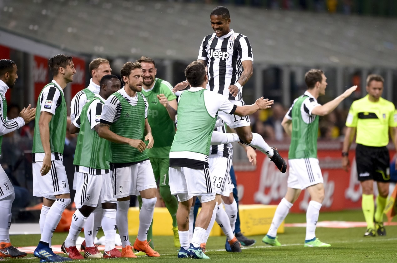 Douglas Costa (C) of Juventus FC celebrates with his teammates after scoring the opening goal during the Serie A football match between FC Internazionale and Juventus FC. /VCG Photo