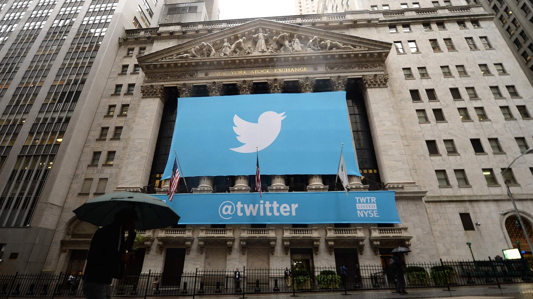 A banner with the Twitter logo on the front of the New York Stock Exchange in New York. /VCG Photo