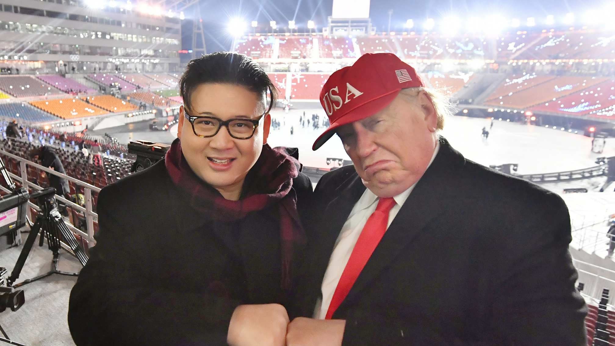 Men resembling US President Donald Trump (R) and DPRK's leader Kim Jong Un appear at the opening ceremony of the Pyeongchang Winter Olympics in South Korea on Feb. 9, 2018. /VCG Photo