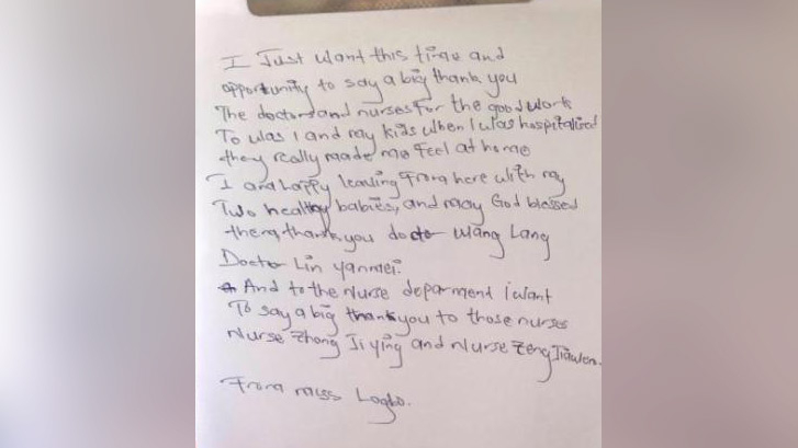The appreciation letter, which was reportedly written by Logbo before she was discharged from the hospital. /Chinanews Photo