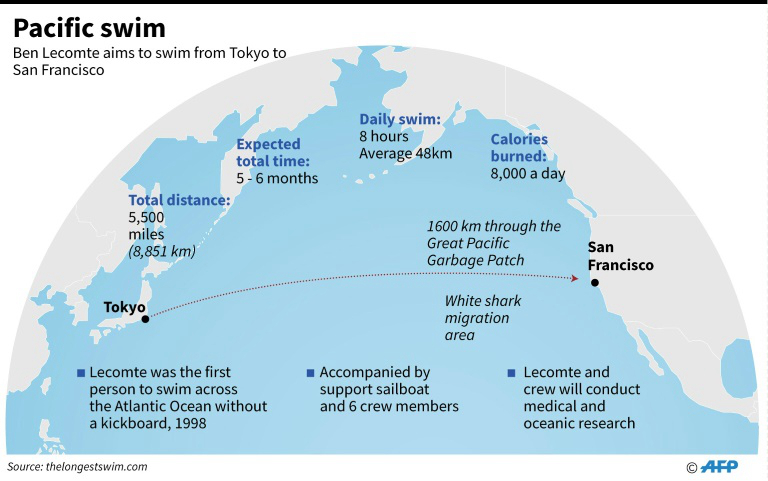 He will face giant waves, sharks and jellyfish, and will also swim through part of the "Great Pacific Garbage Patch" in his attempt to be the first to accomplish the feat of swimming across the world's biggest ocean.