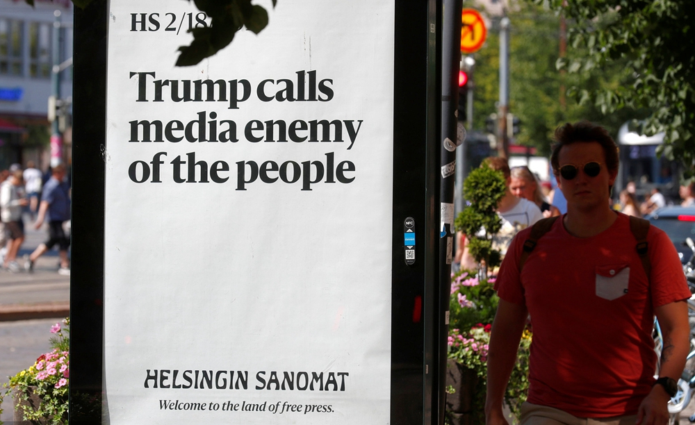 An advert in a Finnish newspaper is displayed during the US President Donald Trump and Russian President Vladimir Putin's summit in Helsinki, July 16, 2018. /VCG Photo