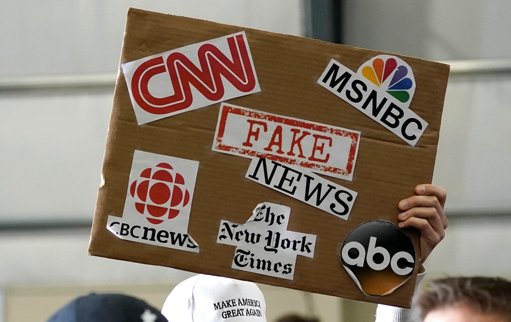 A Trump supporter holds up a sign showing major news organizations along with the words "fake news" at a Trump rally in Washington, Michigan, US, April 28, 2018. /VCG Photo