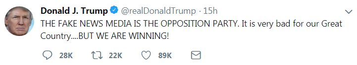 In a tweet on Thursday morning, he said, "THE FAKE NEWS MEDIA IS THE OPPOSITION PARTY.”