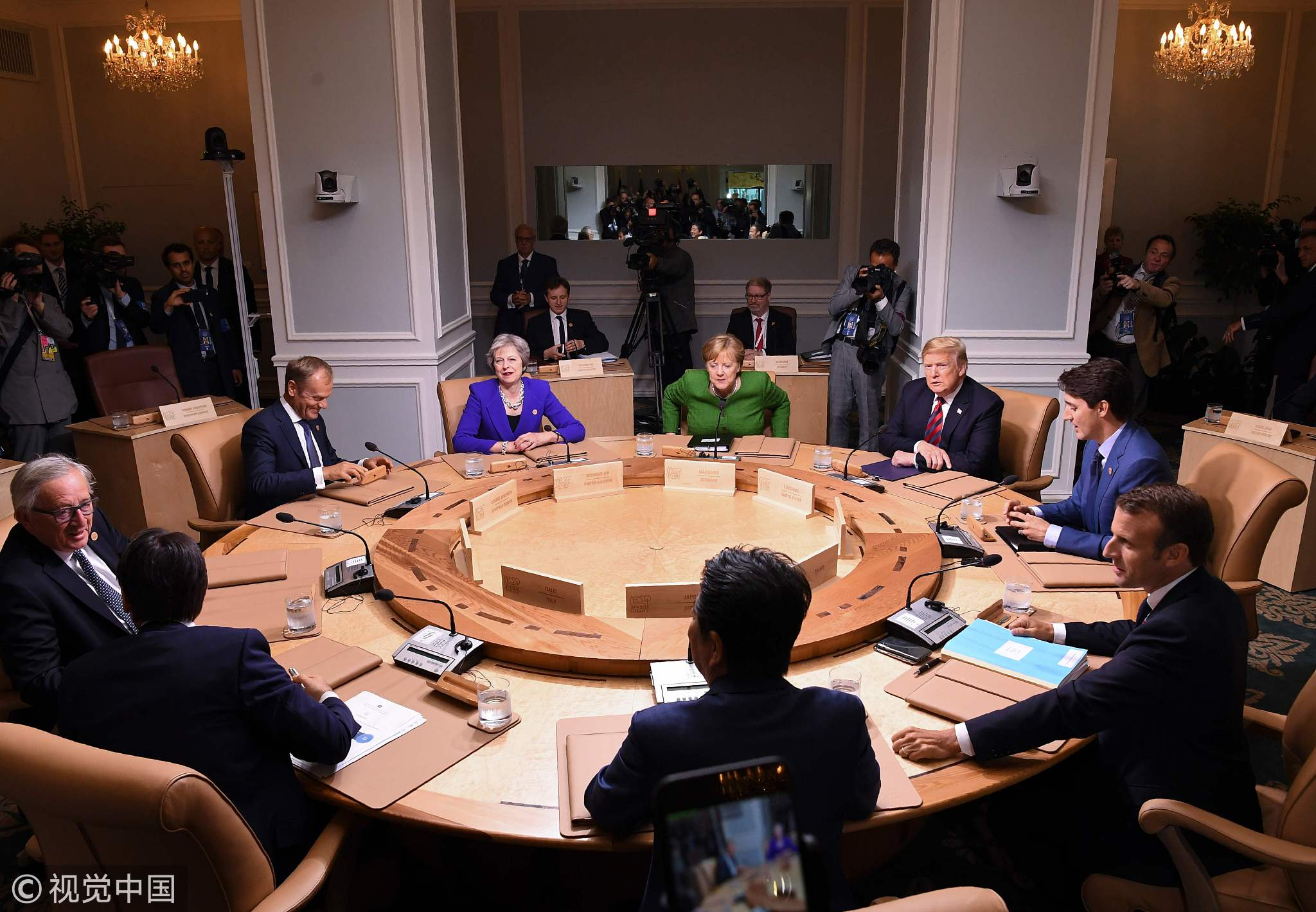 Leaders of the G7 participate in a working session of the G7 summit in La Malbaie, Quebec, Canada, June 8, 2018. /VCG Photo.