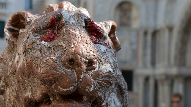 One of the two stone lions that stand guard next to Venice's famed St. Mark's Basilica has been splashed with red paint.