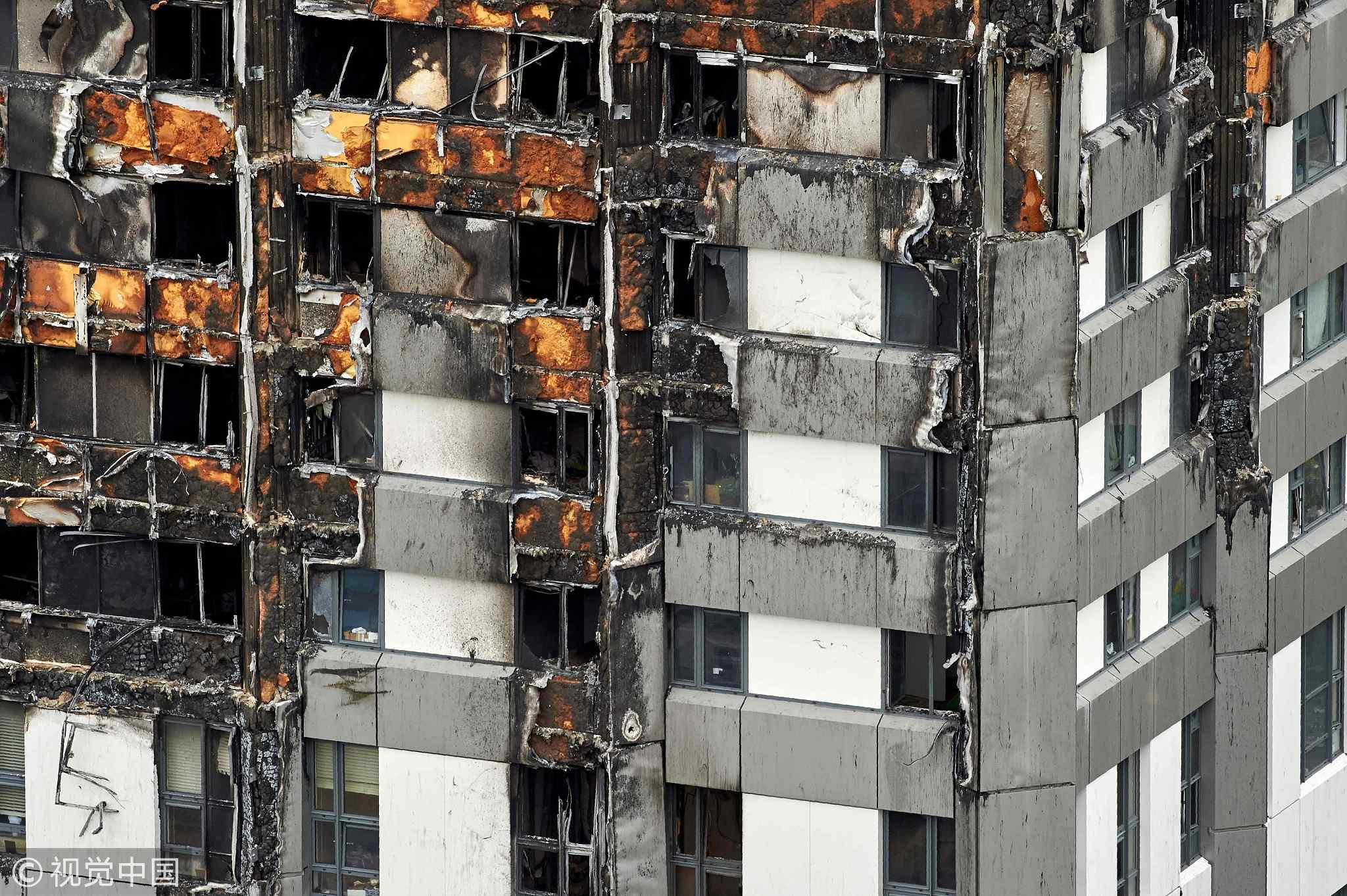 June 22, 2017: The unburned lower floors with untouched cladding still in place, with the burnt out upper floors above, at remains of the Grenfell Tower block in north Kensington, west London. /VCG Photo