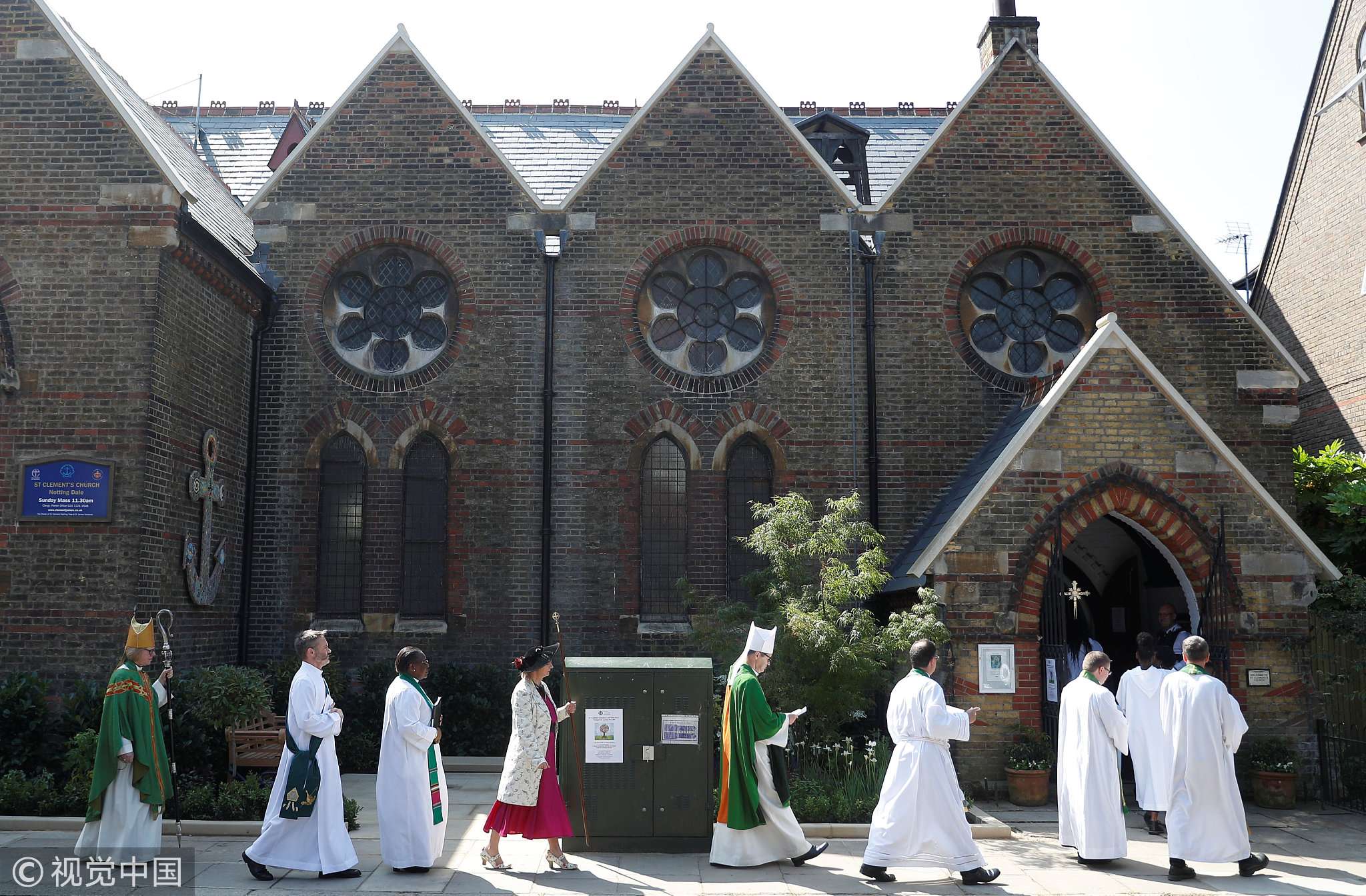 The Bishop of London Right Rev Sarah Mullally and Bishop of Kensington Right Rev Graham Tomlin process into St Clement's Church for a dedication service for the St Clement Garden of Peace and Healing, June 10, 2018, remembering those affected by the Grenfell Tower fire in London. /VCG Photo